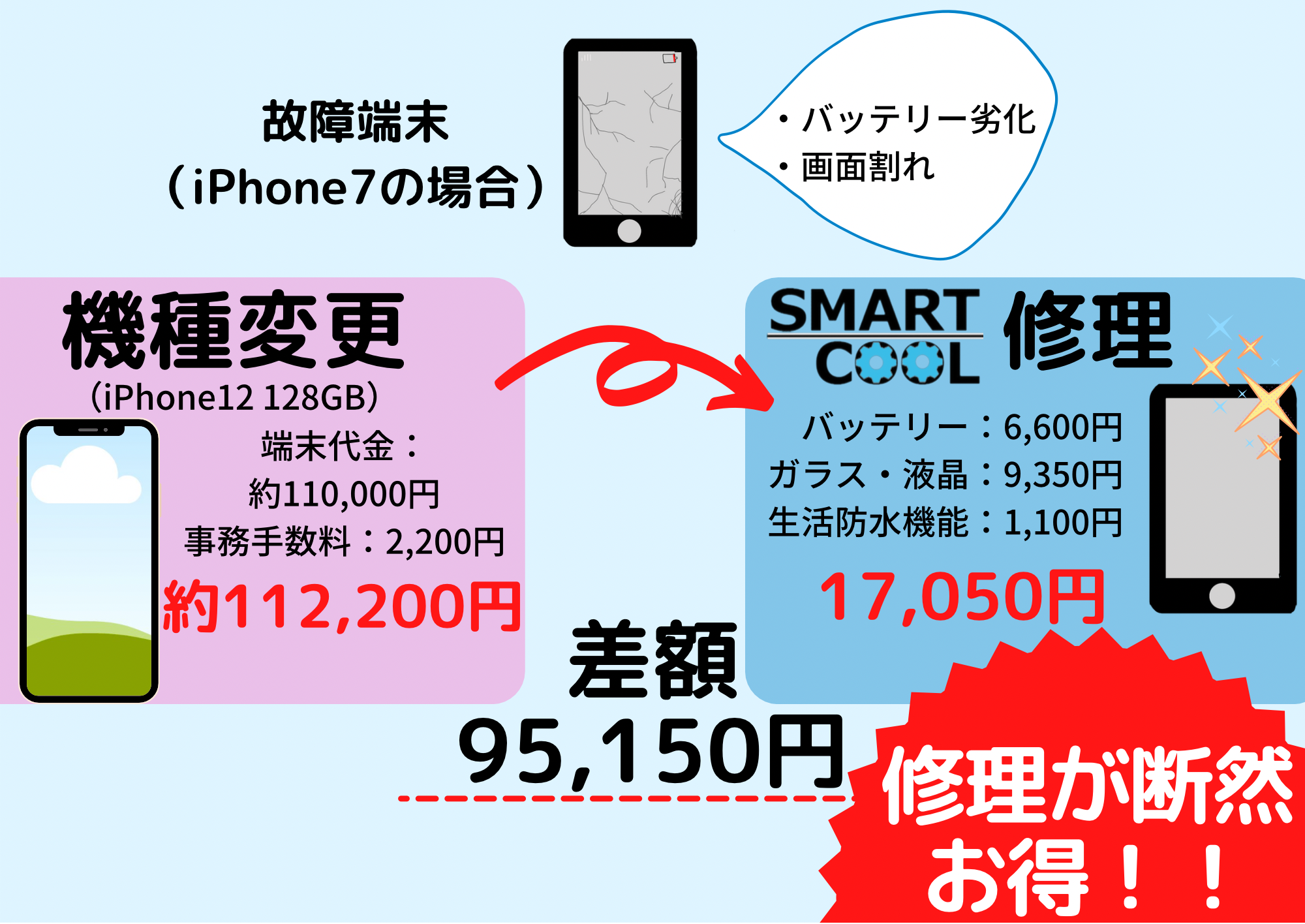 画面修理はもちろん、バッテリー交換や水没復旧作業など